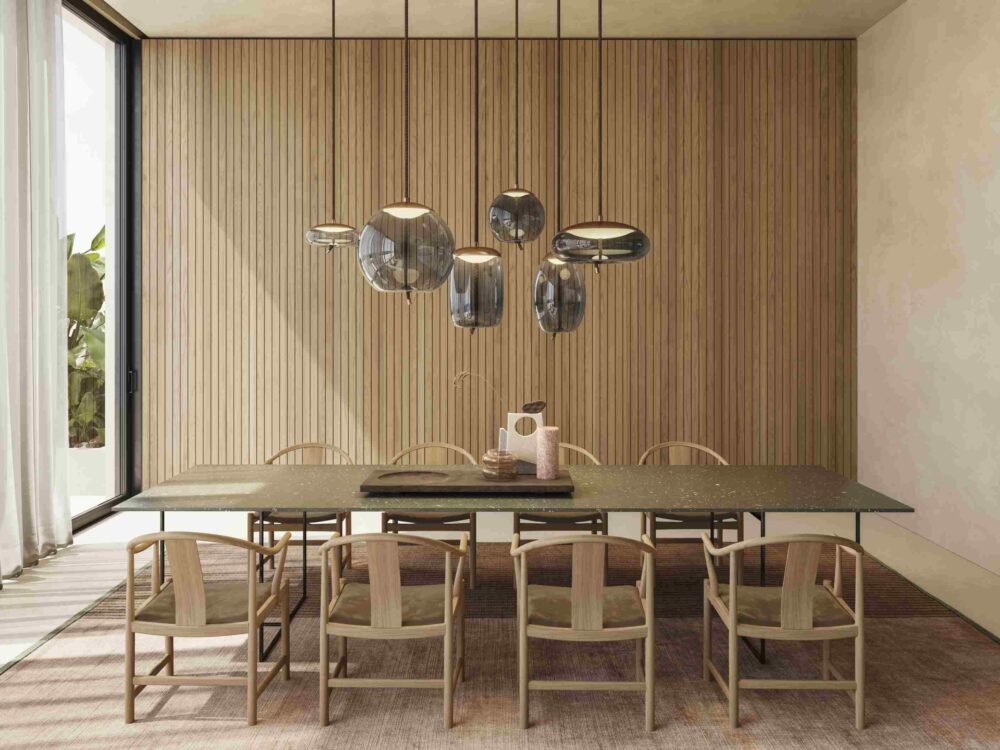 - Geschickt kombinieren: Unterschiedliche Arten von Leuchten einsetzen, um ein stimmungsvolles Ambiente zu erzielen – eine dekorative Pendelleuchte über dem Esstisch, kombiniert mit einer Stehleuchte und mehreren Bodenleuchten.