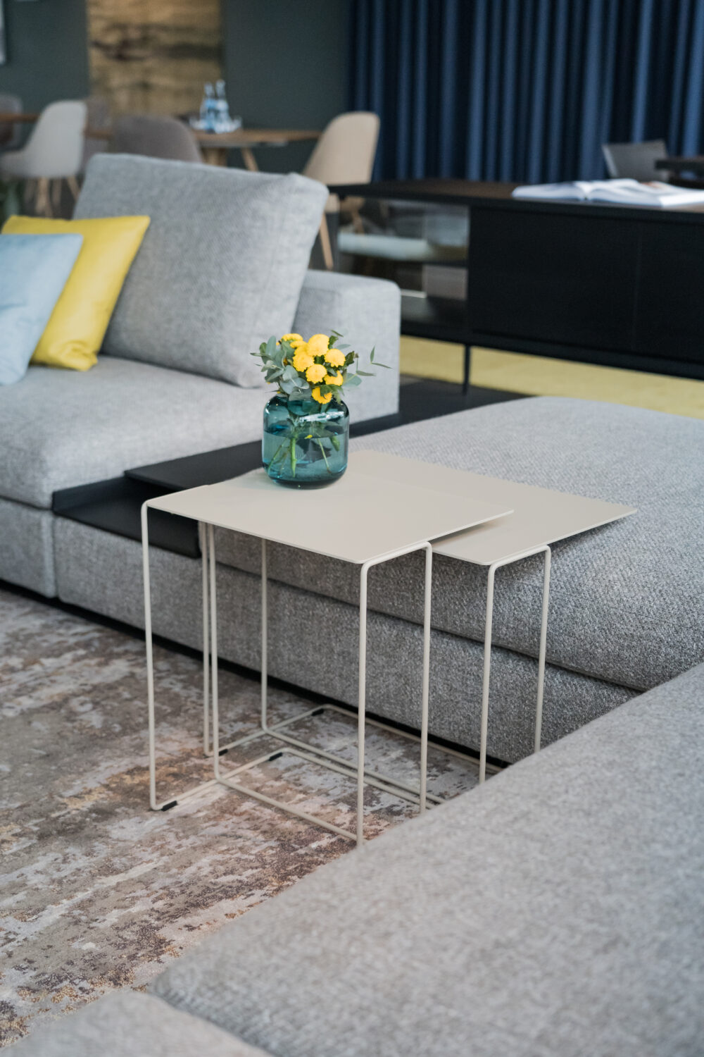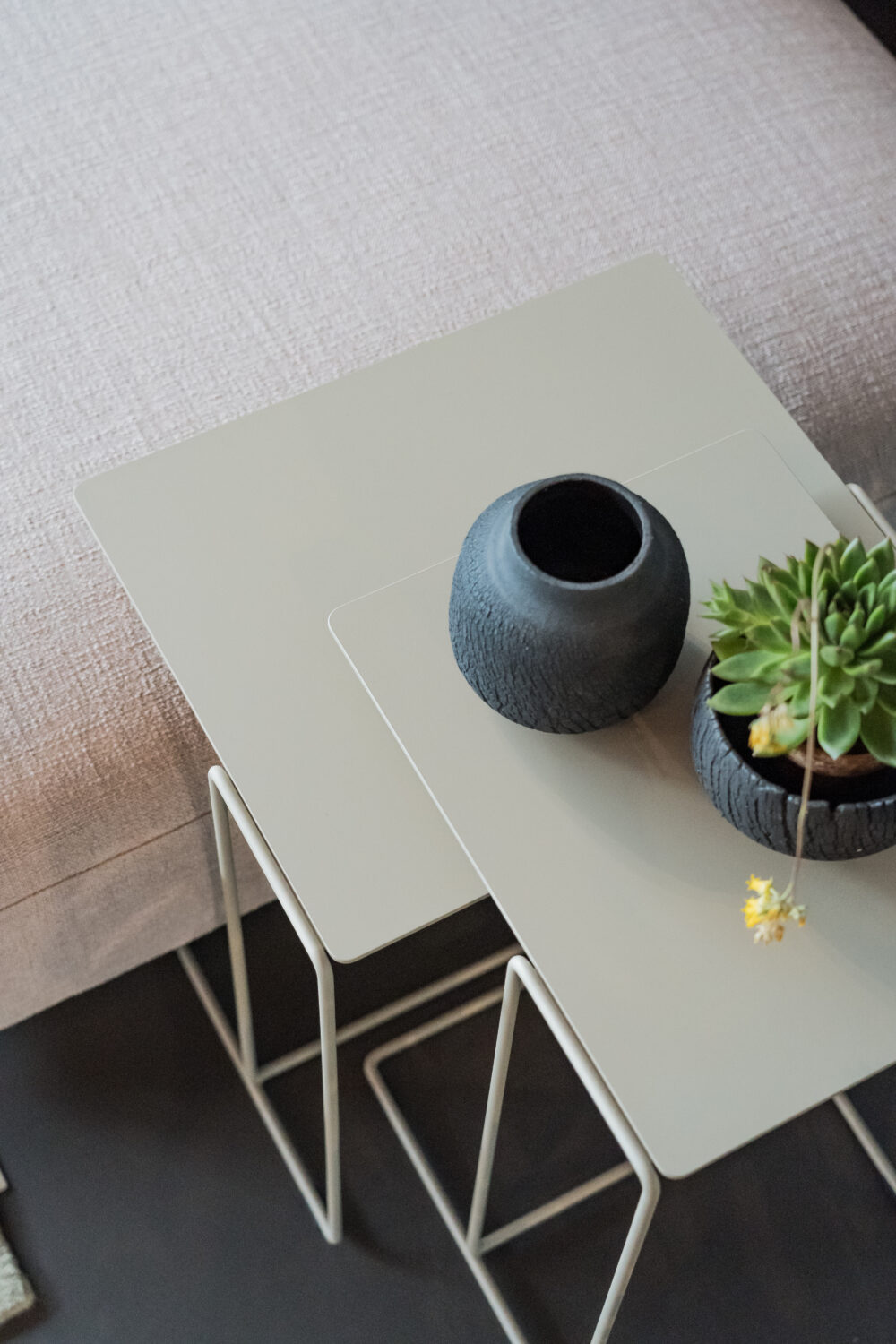 Wertig und praktisch: Der Oki Side Table findet leicht seinen Platz am Sofa. Wahlweise rund oder rechteckig, in Bronzematt, Schwarzmatt oder Sand. Das filigrane Drahtgestell trägt die Tischplatte. Minimalismus at its best!