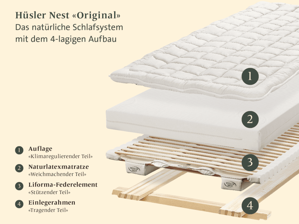 Alle Hüsler Schlafsystem Kombinationen haben eines gemeinsam: Das Liforma Federelement. Es unterscheidet sich von allem bisher gekannten Bettinhalten und bietet Ihnen den einzigartigen Hüsler Schlafkomfort.