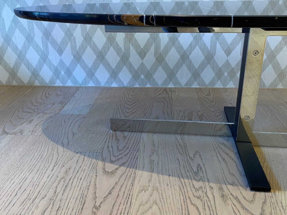 | Details | Ausführung Marmor Sahara Noir Mit orangen Einschlüssen Tischfuss aus Metall schwarz gaufiert und glänzend verchromt Breite 120cm oval Höhe 36cm |