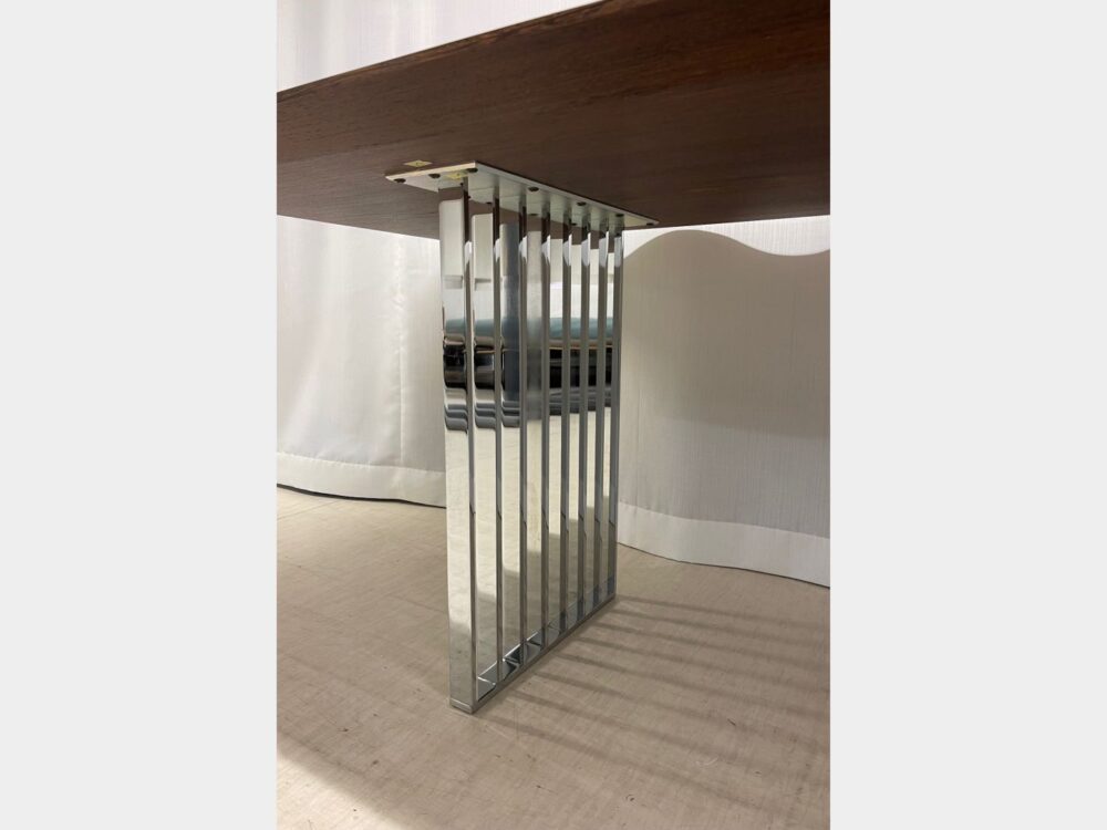 | Details | rechteckig, Massivholzplatte Wenge natur geölt, BV 28 brettverleimt, 2 Stahlgitterwangen glanzverchromt Breite 240cm, Tiefe 90cm, Höhe 73cm |