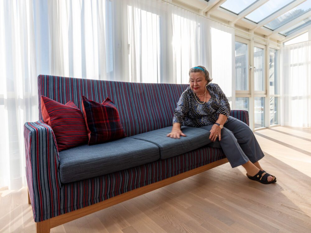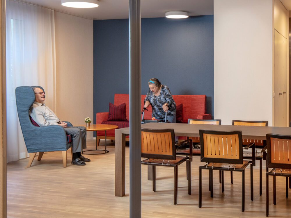 «Für das Seniorenzentrum Zwyden haben wir ein Gestaltungskonzept entwickelt, welches die Wohnlichkeit unterstützt und zum Verweilen einlädt.» KompetenzenInnenarchitekturGestaltungskonzeptLichtkonzeptFarbkonzeptTextile Akustik-SpanndeckenWohnkomfort im AlterFidera PolstermöbelVorhänge